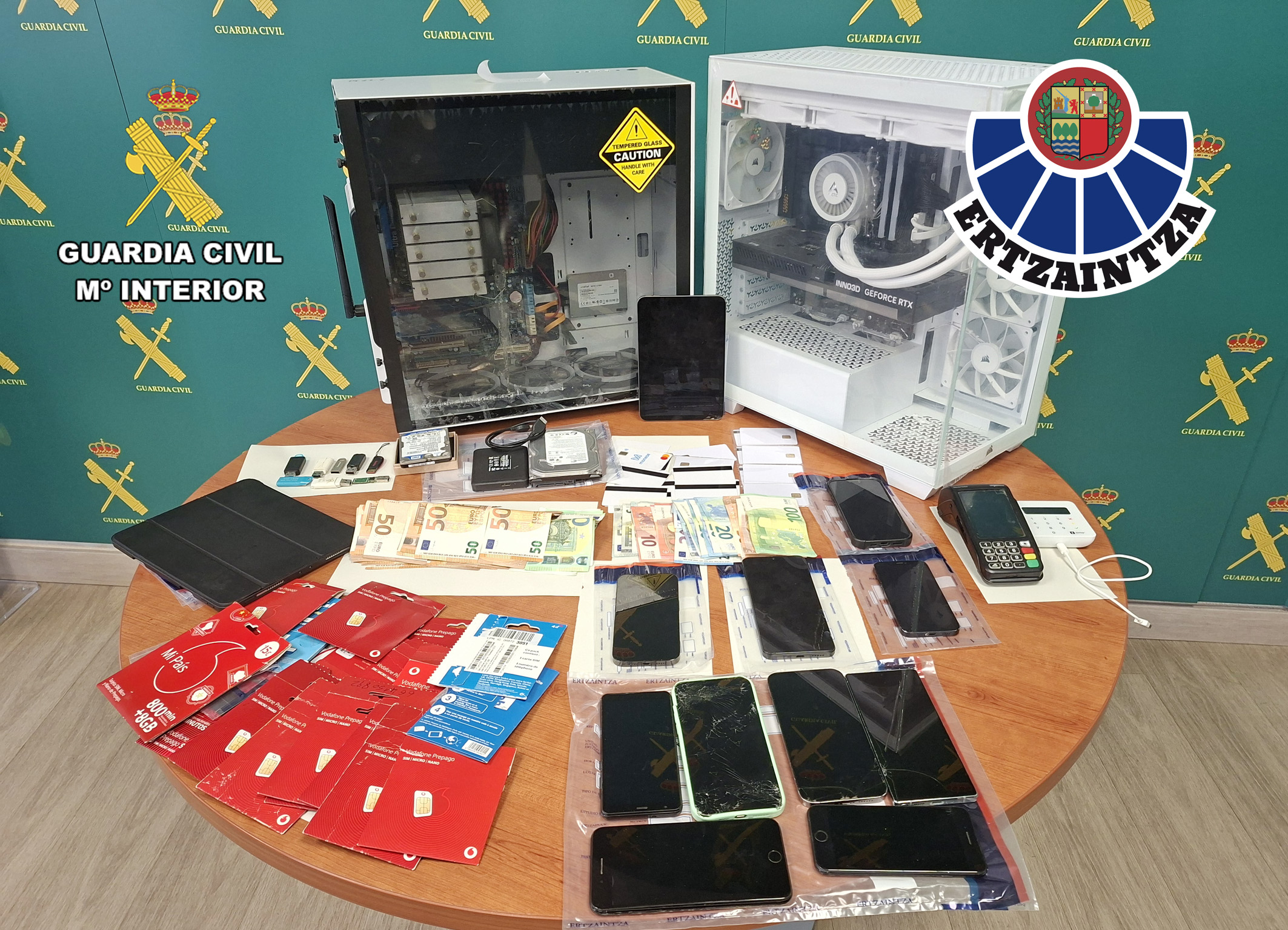 Horrez gainera, eskudirua eta beste pertsona batzuen dokumentazioa ere atzeman dituzte, eta Segurtasun sailaren arabera, horrek agerian uzten du talde kriminal horren gaitasun operatibo handia eta leporatzen zaizkien delituak egiteko erabilitako metodoen sofistikazioa. Bi atxilotuak, 22 eta 26 urtekoak dira, eta konfiskatutako gauzekin eta instruitutako eginbideekin batera, instrukzioaz arduratu diren Tolosako eta Cartagenako epaitegien eskuetan jarri dituzte.